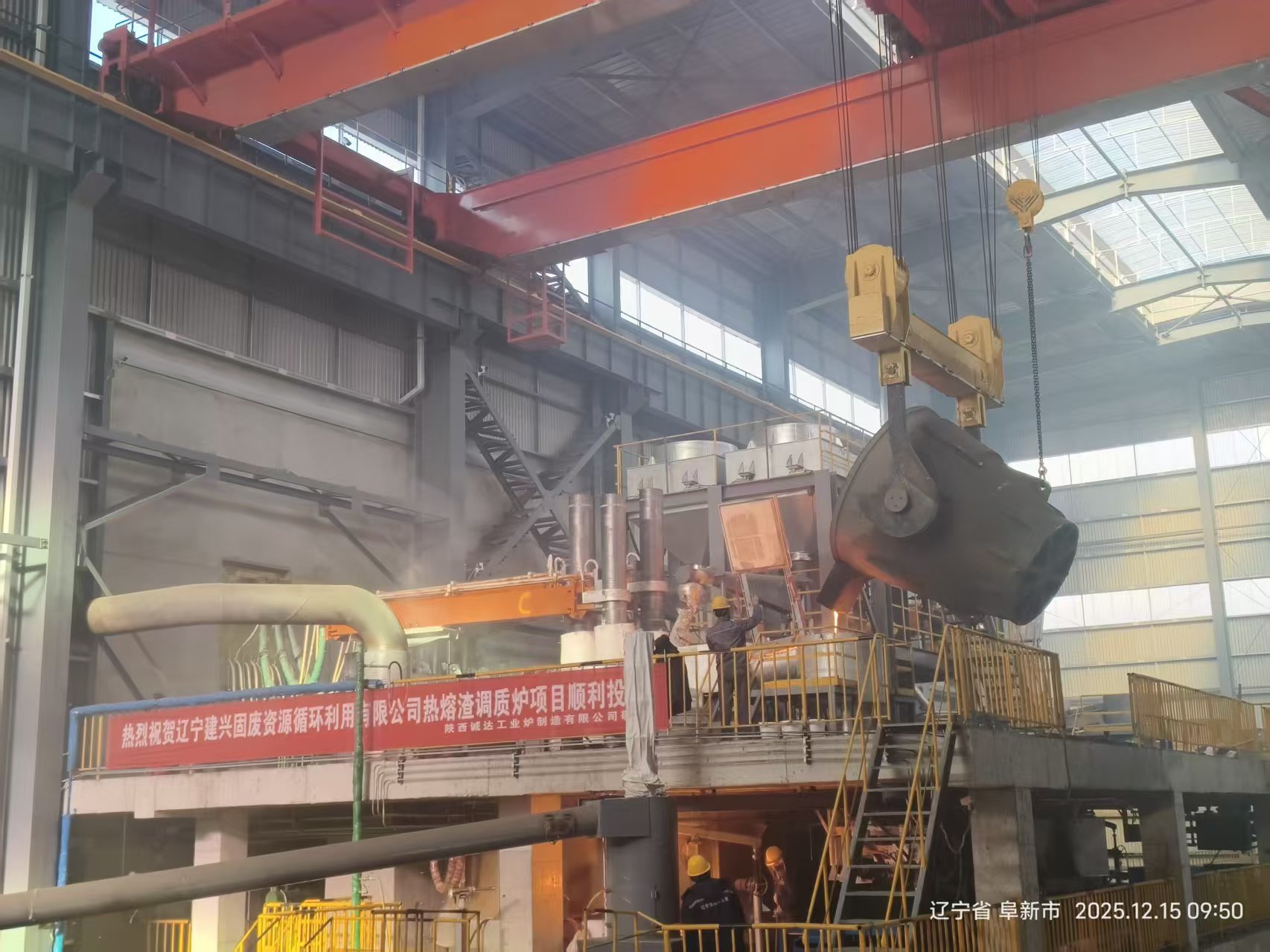 - استقبال الخبث: يتم تغذية الخبث المنصهر الساخن بدرجة حرارة 1200-1300 درجة مئوية إلى الفرن عبر مزالق مغلقة / أوعية خبث.